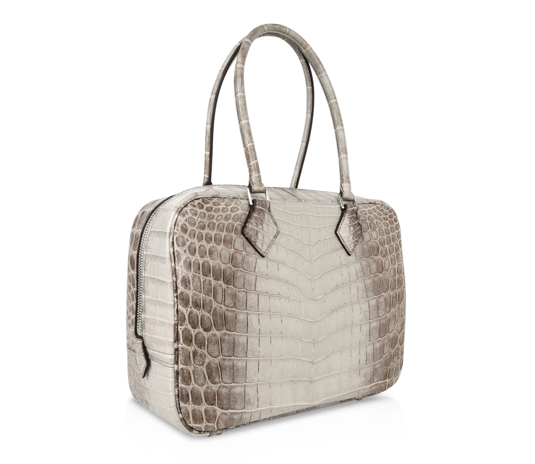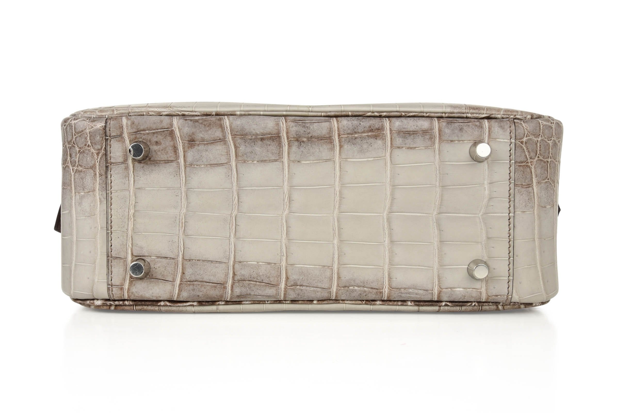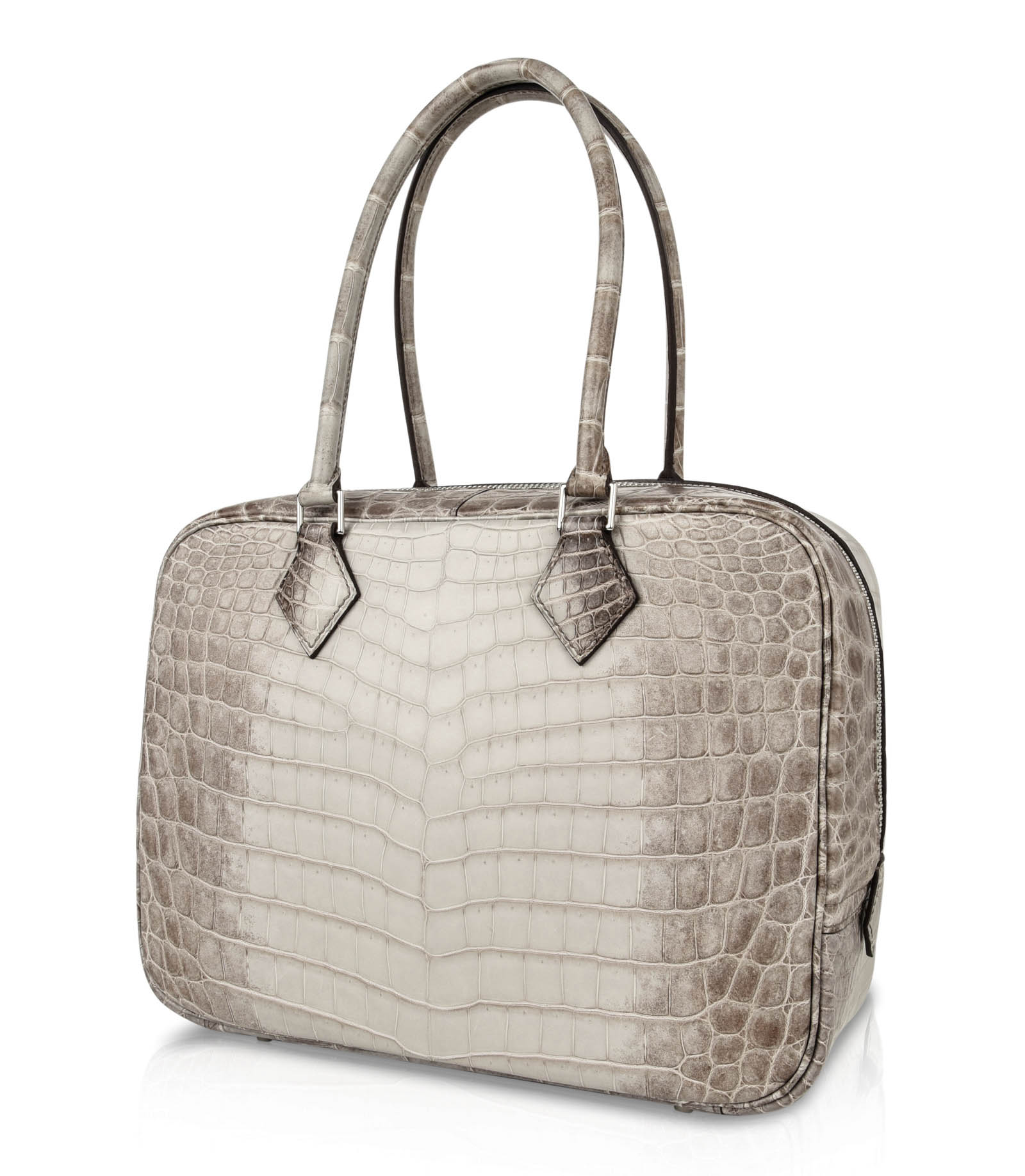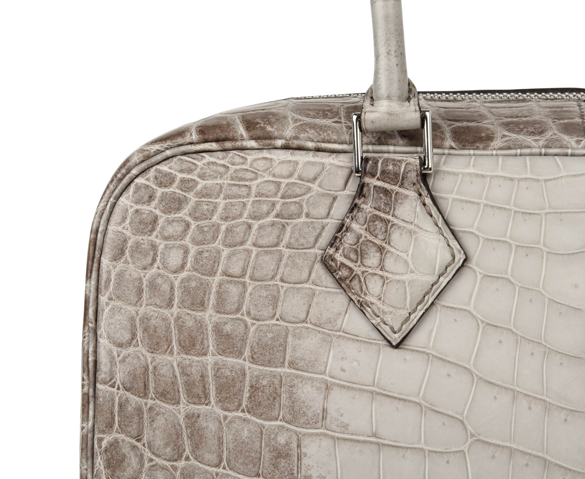 Guaranteed authentic Hermes Plume 28 bag features Niloticus Crocodile Gris Cendre Himalaya.