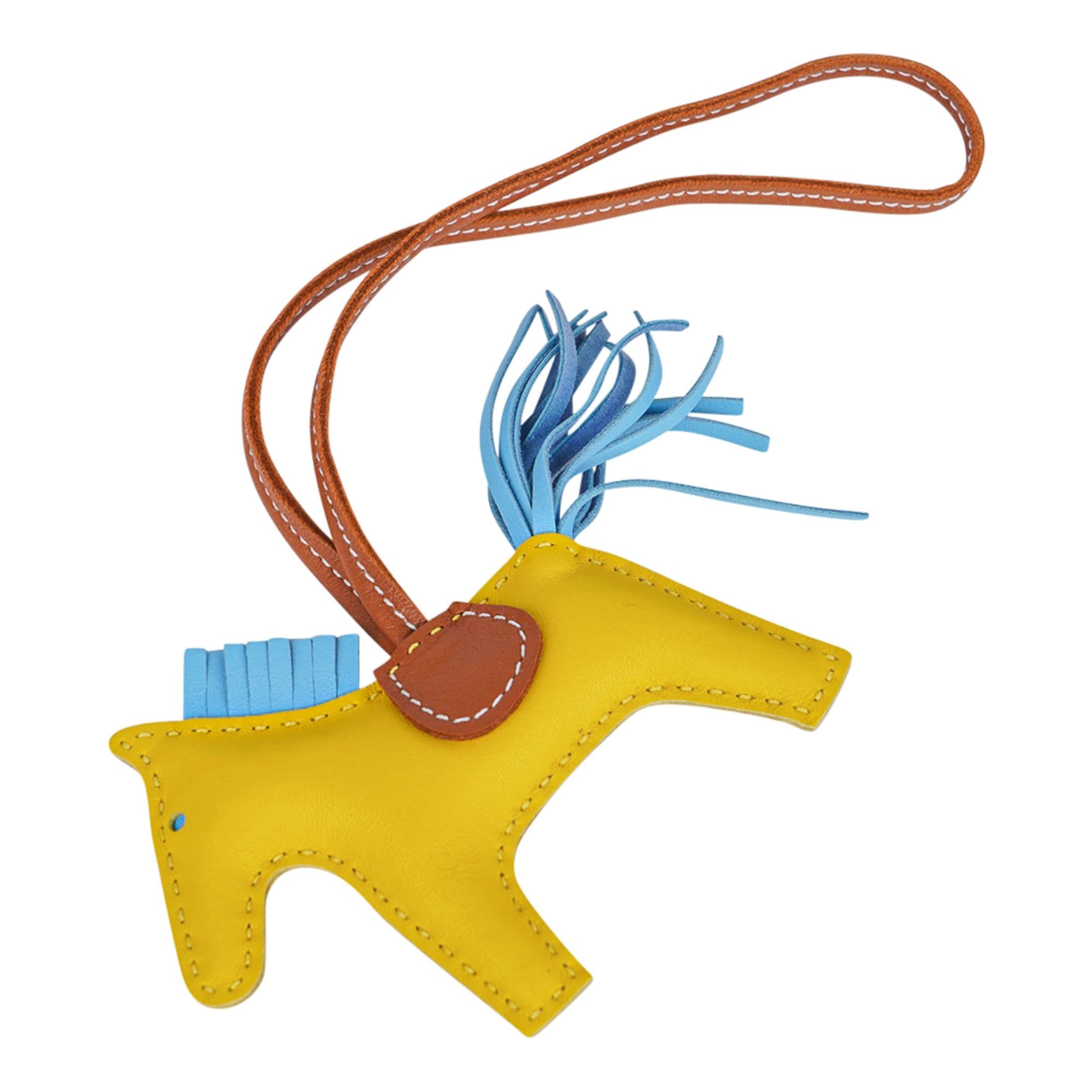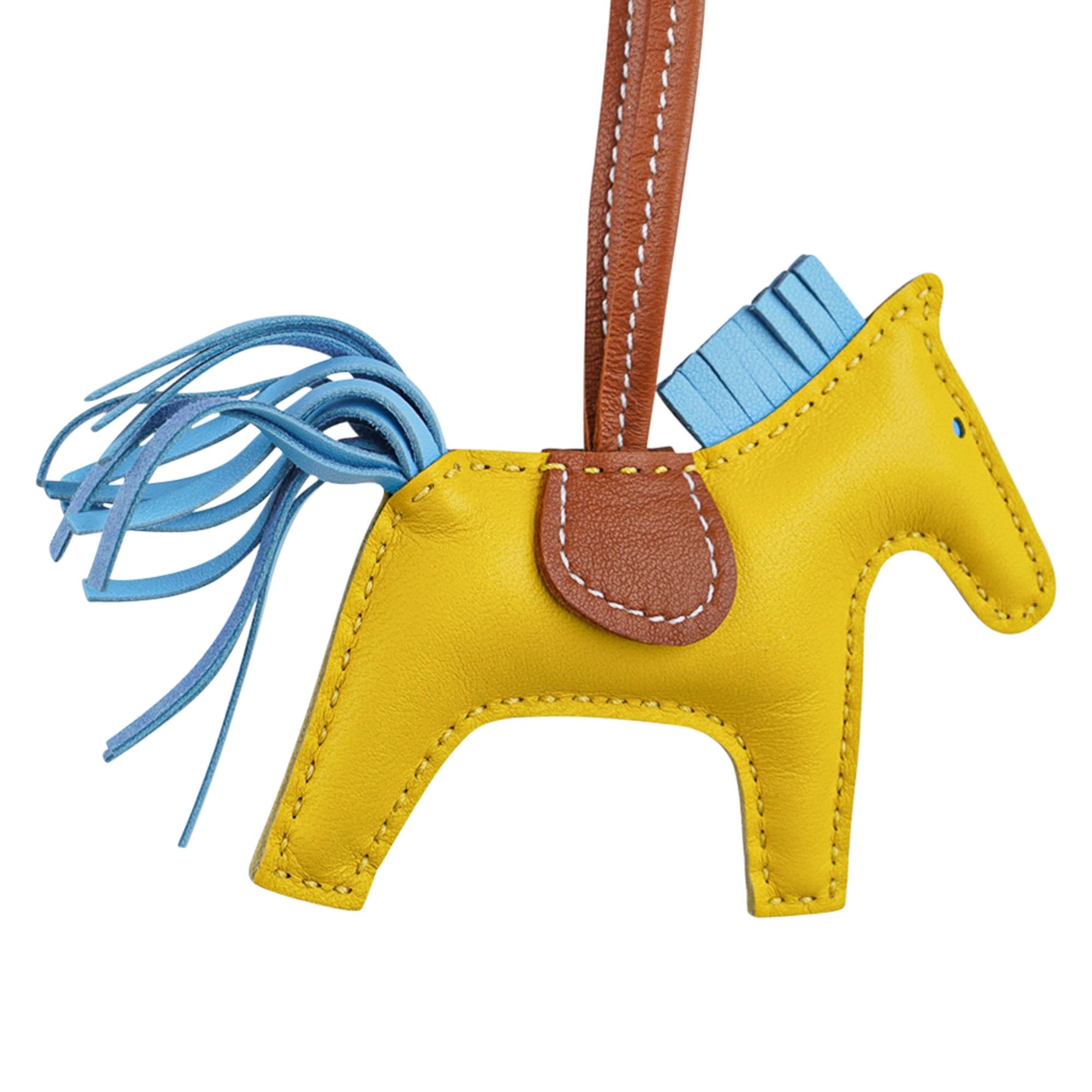 Guaranteed authentic coveted Hermes PM Rodeo bag charm featured in Jaune de Naples, Blue Celeste and Gold.