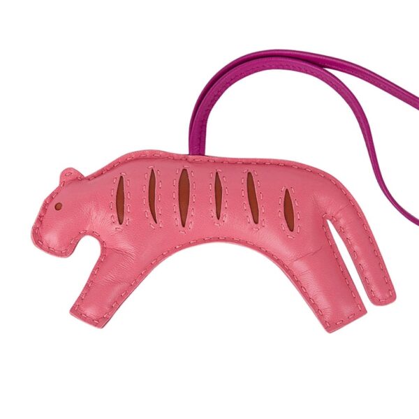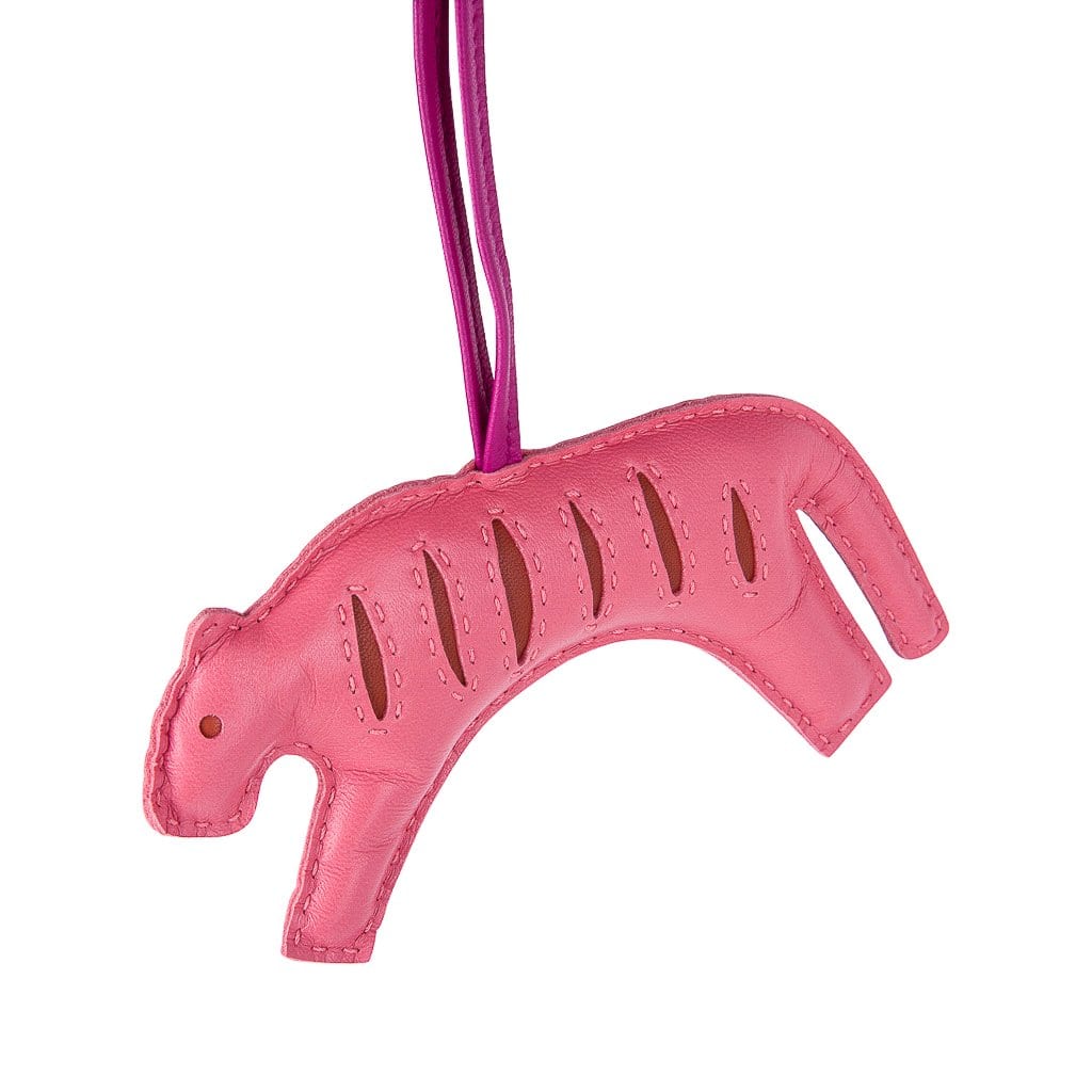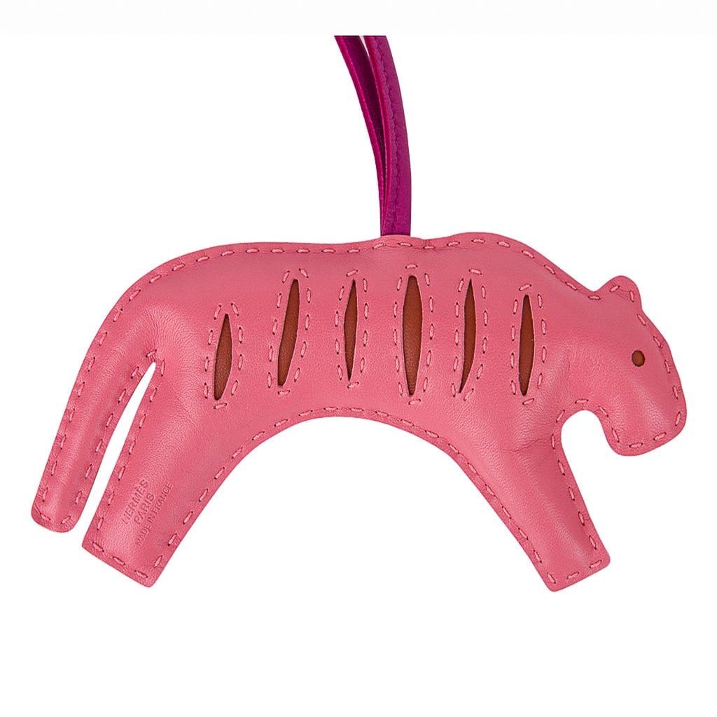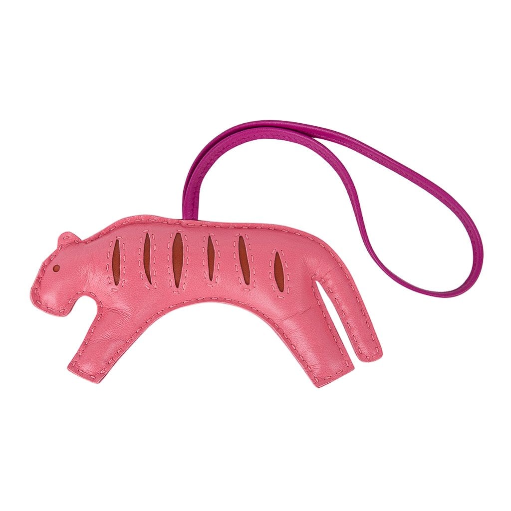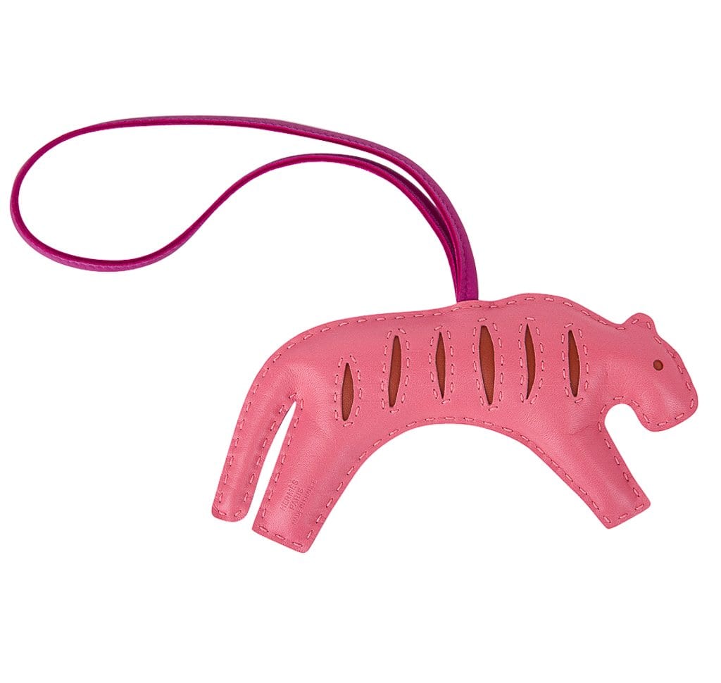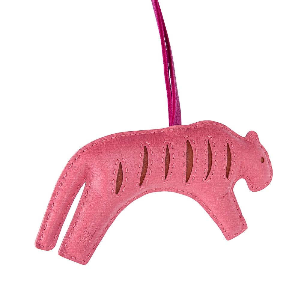 Guaranteed authentic coveted Hermes Rooroo Tiger bag charm in Rose Azalee, Pain d’Epice, and Rose Pourpre.