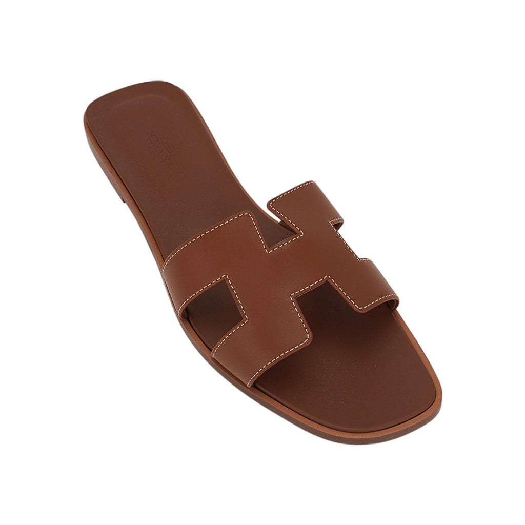 Guaranteed authentic Hermes Oran exquisite Gold box calfskin slide.
