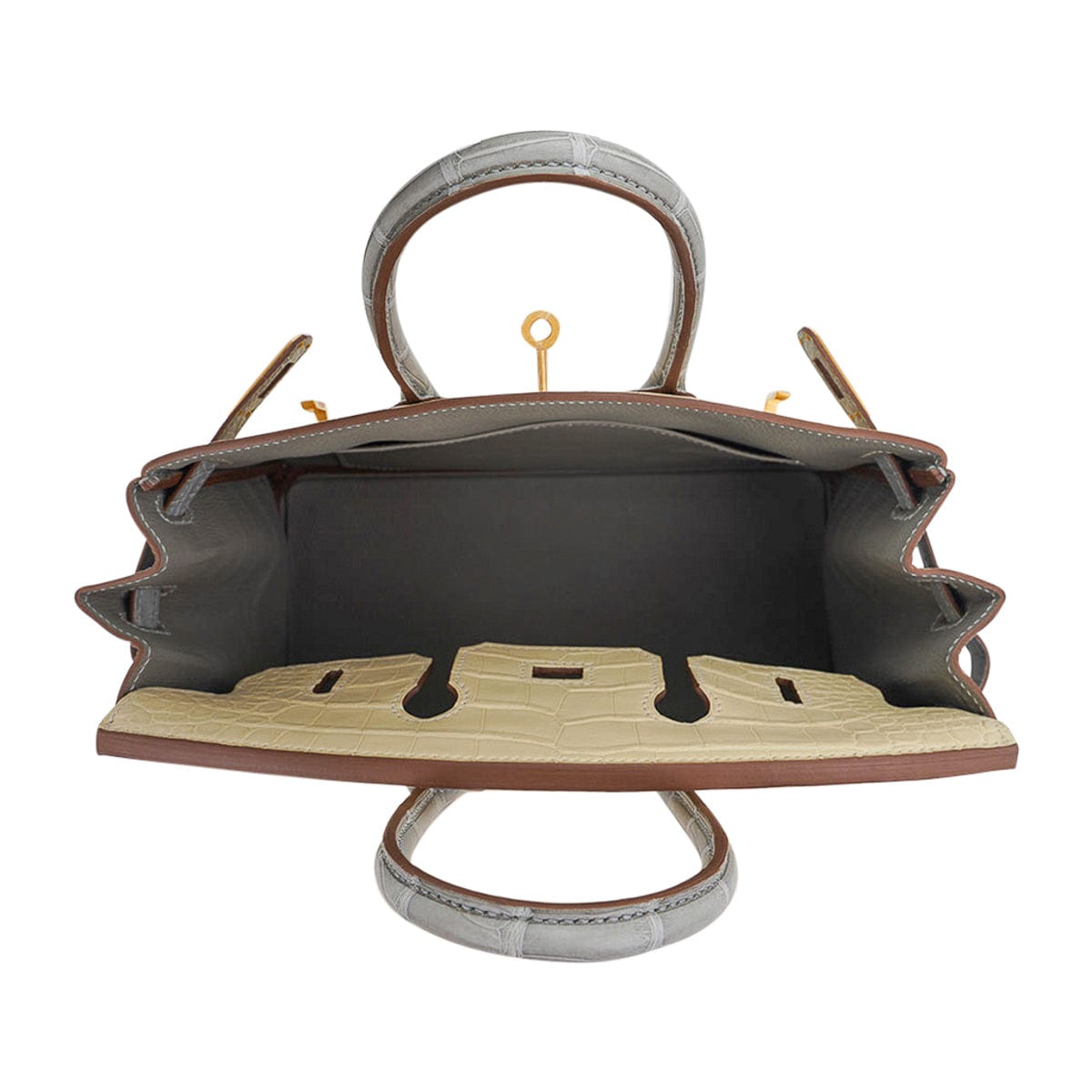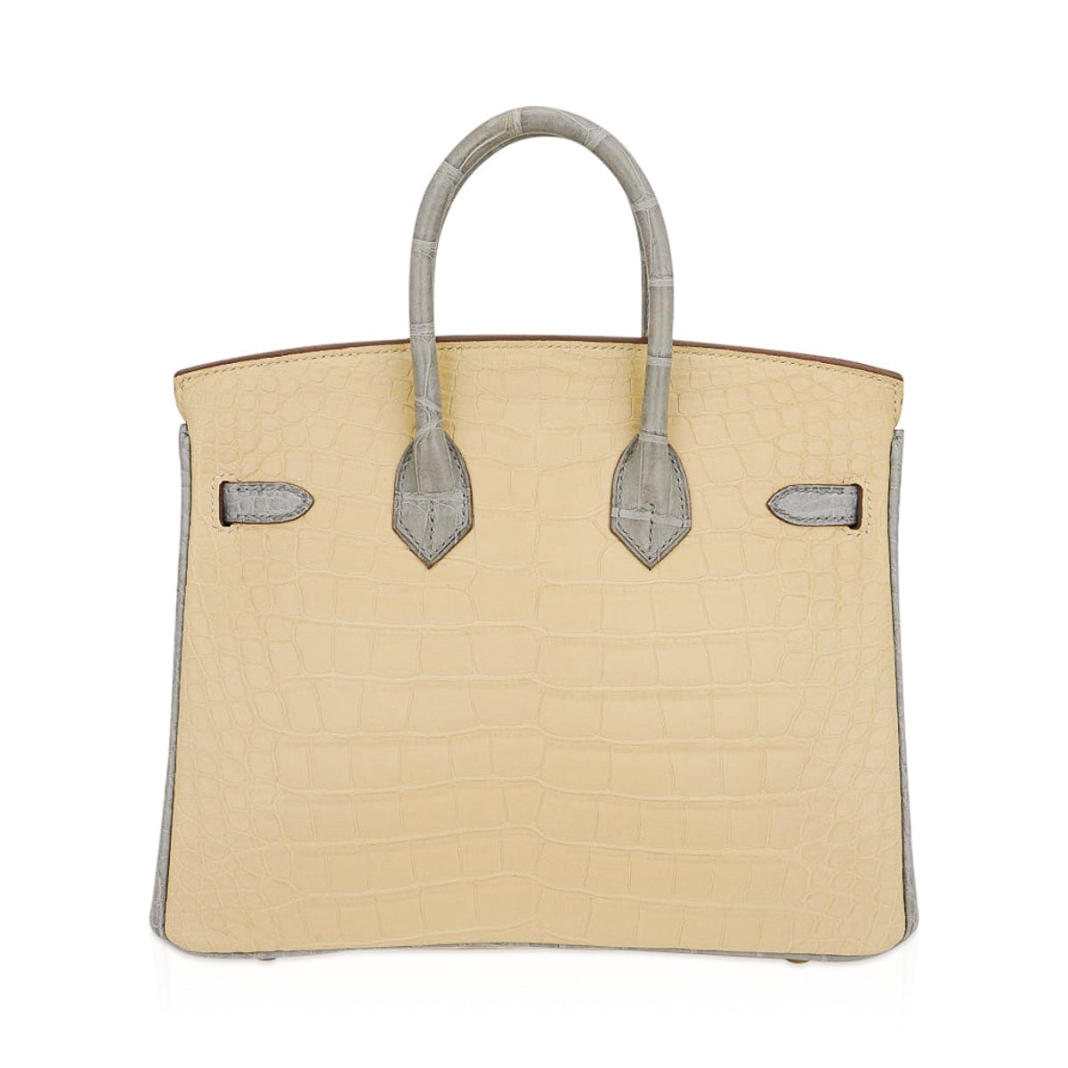 Guaranteed authentic Hermes Birkin 25 bag featured in Vanille and Gris Pearl.