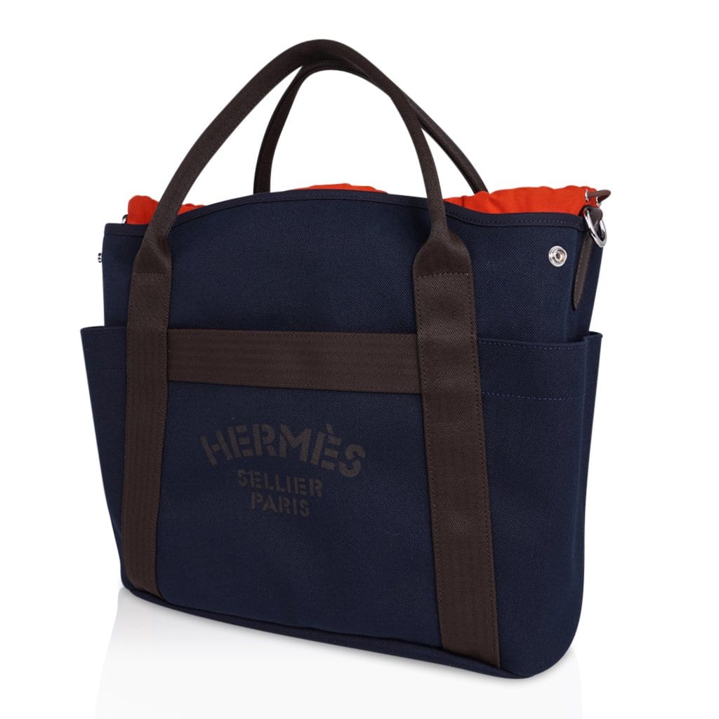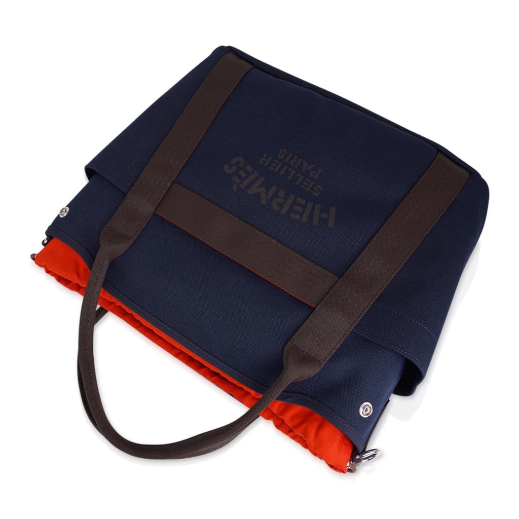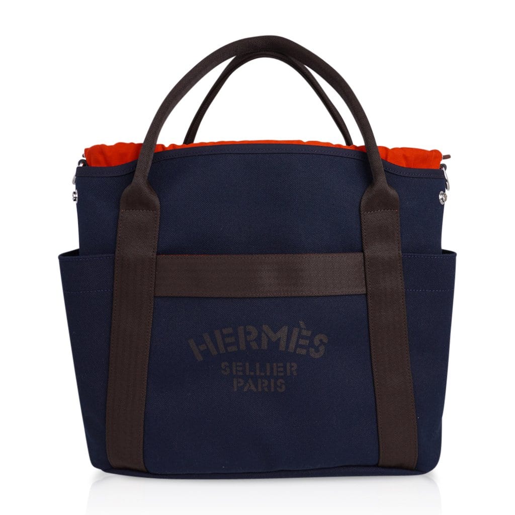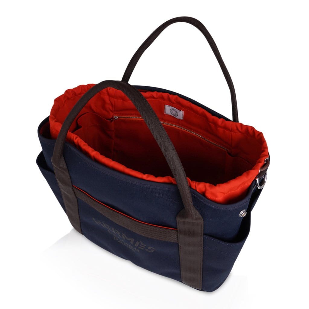 Guaranteed authentic Hermes Sac De Pansage Grooming Bag tote features Bleu Navy canvas with Feu interior and Palladium hardware.