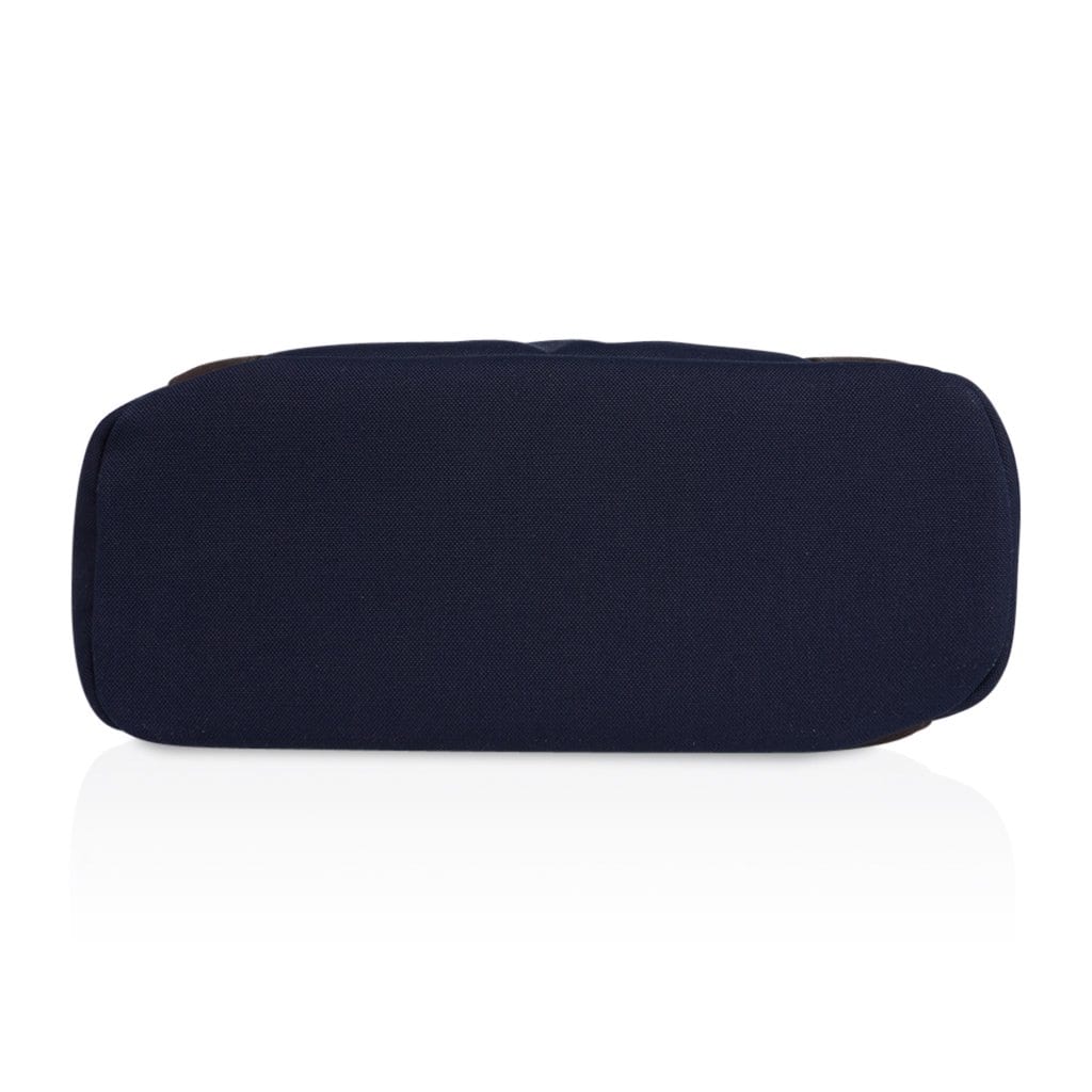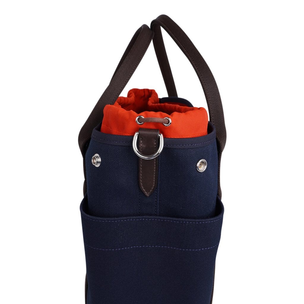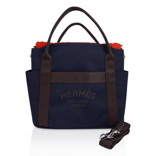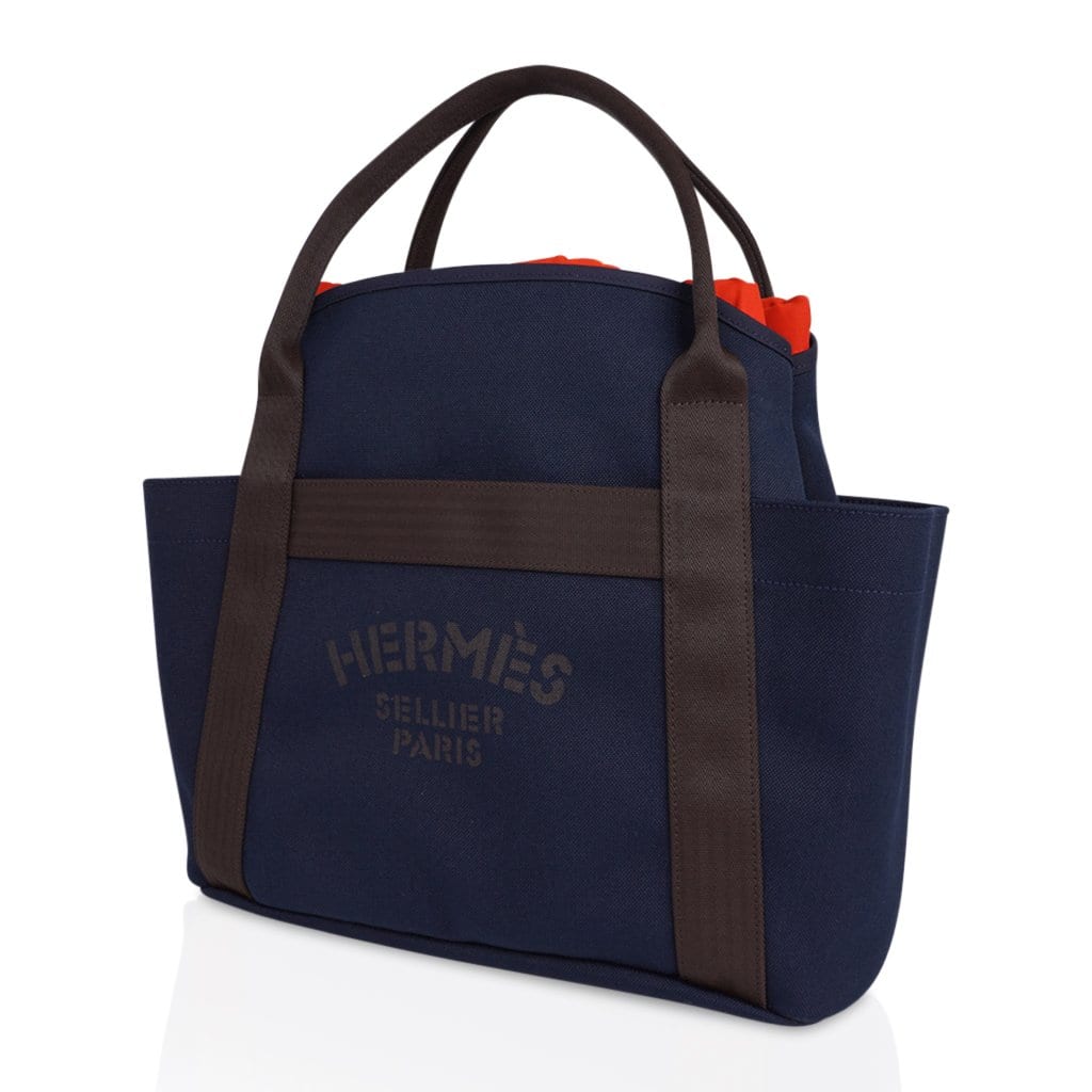 Guaranteed authentic Hermes Sac De Pansage Grooming Bag tote features Bleu Navy canvas with Feu interior and Palladium hardware.