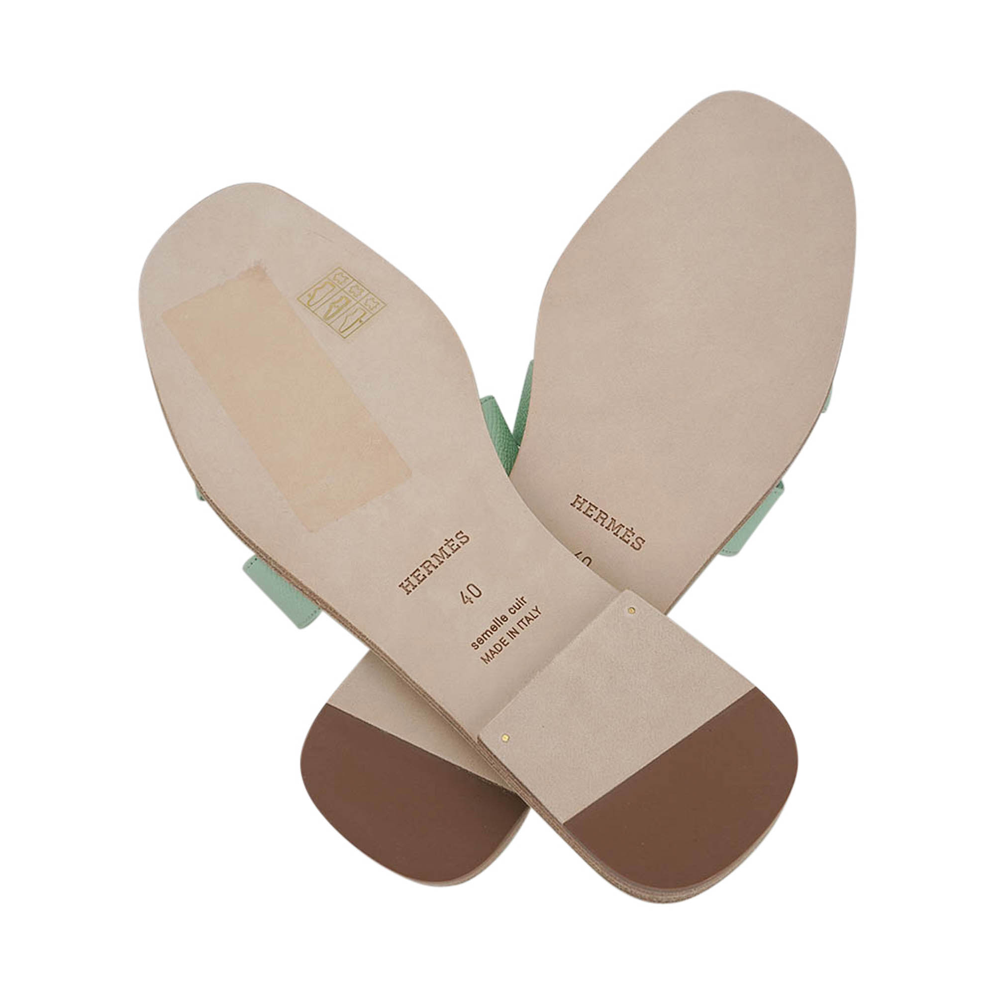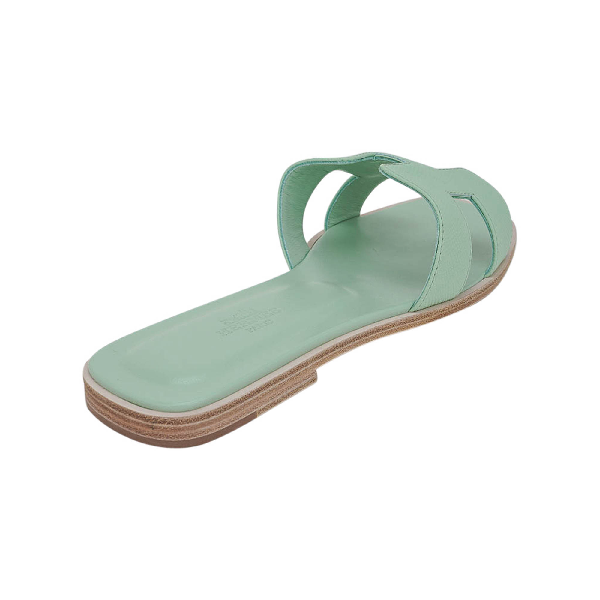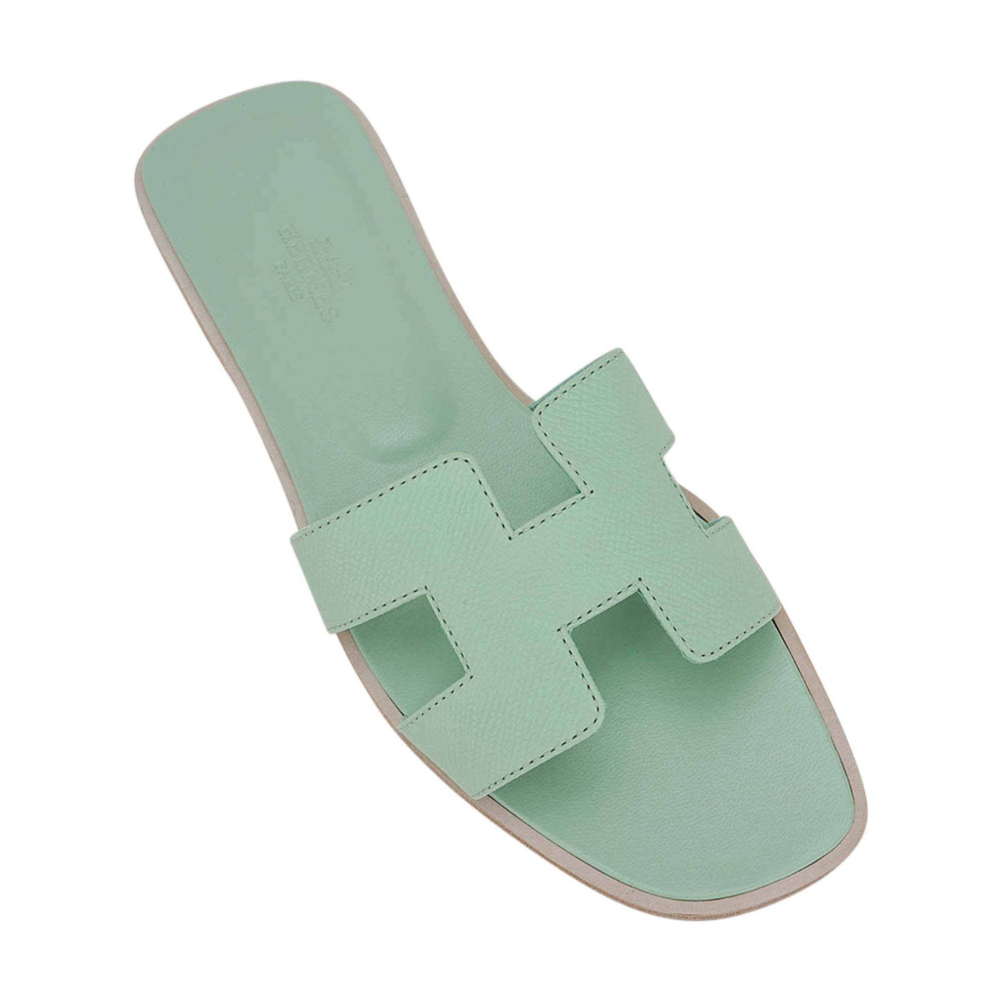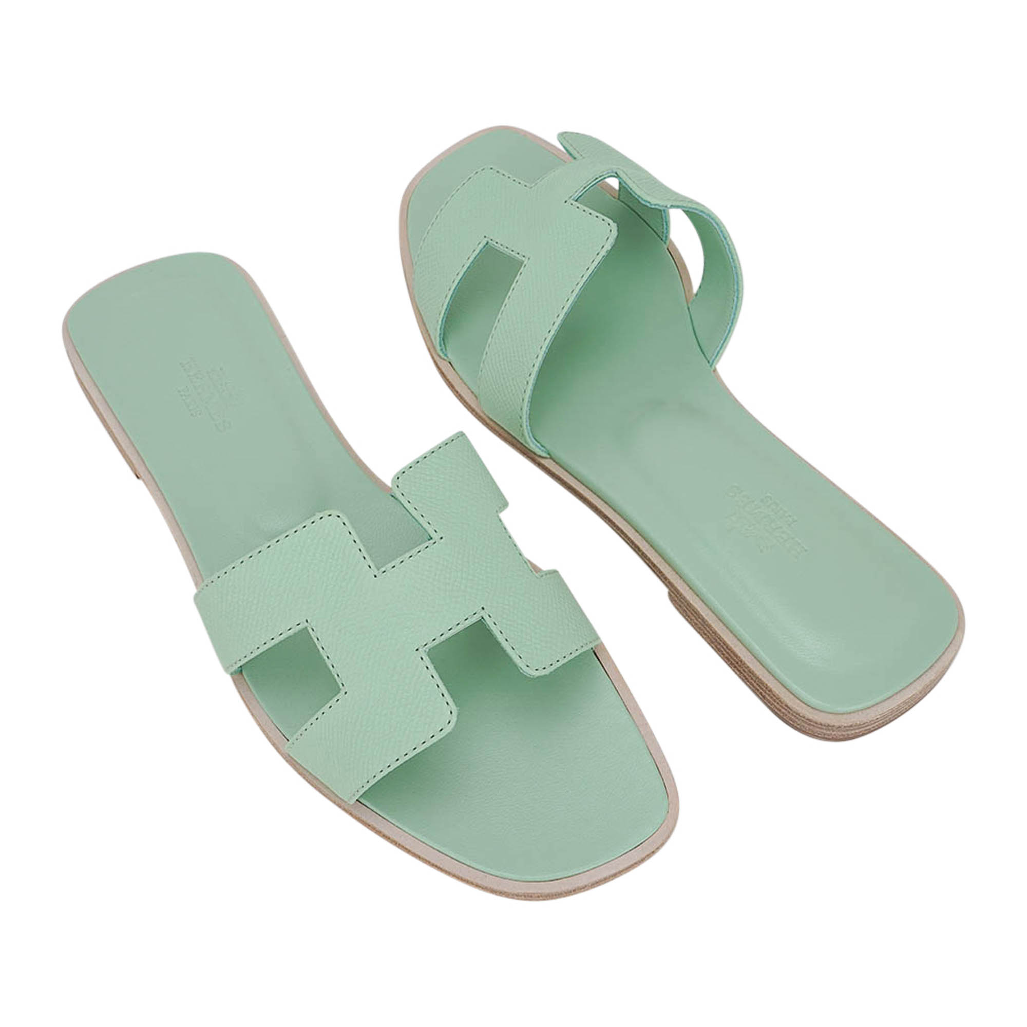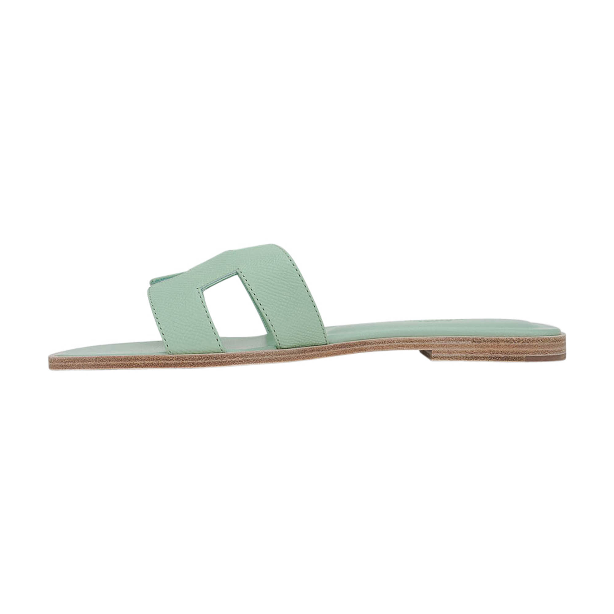 Soft and serene, the Hermès Vert d’Eau Oran Sandal evokes cool waters and minimalist calm