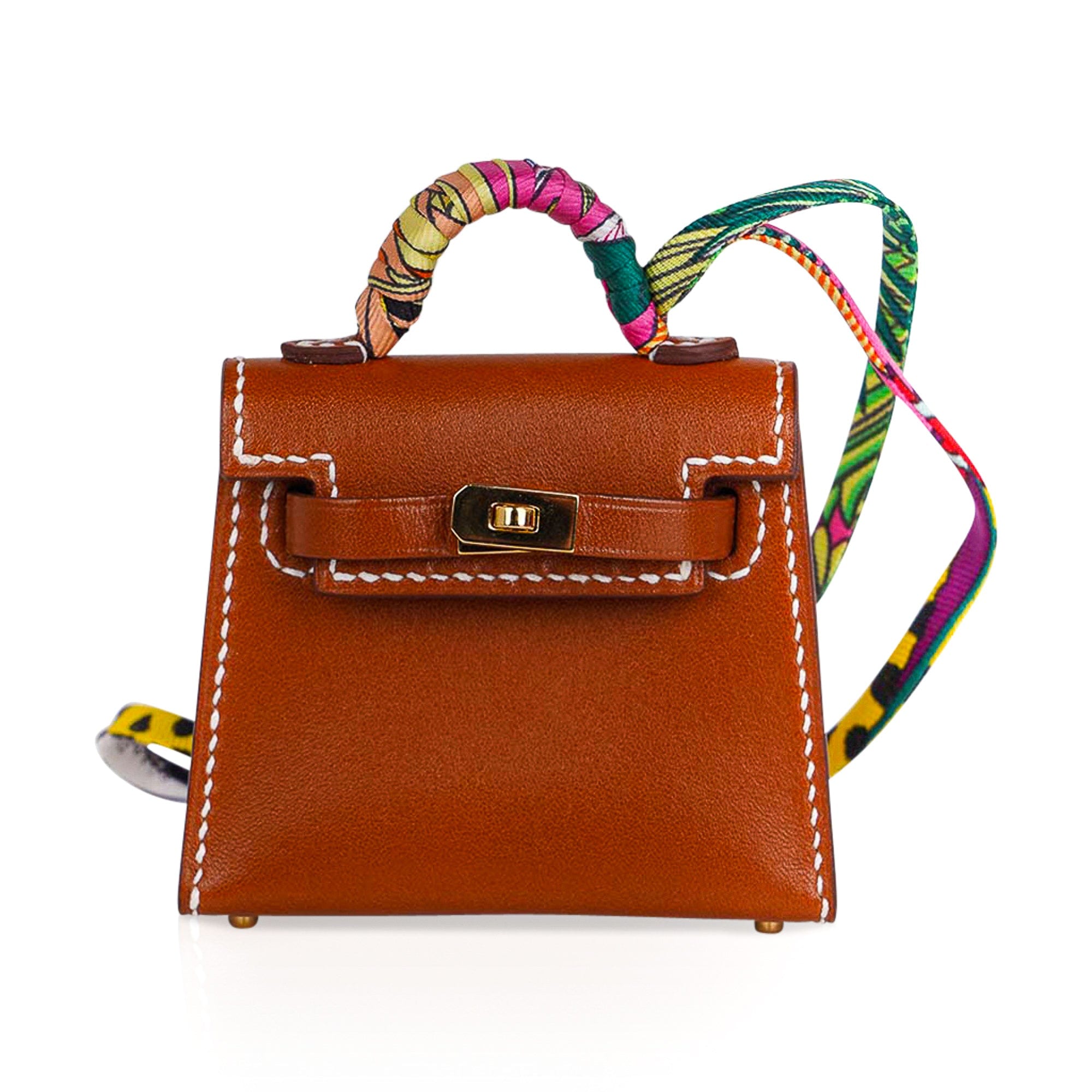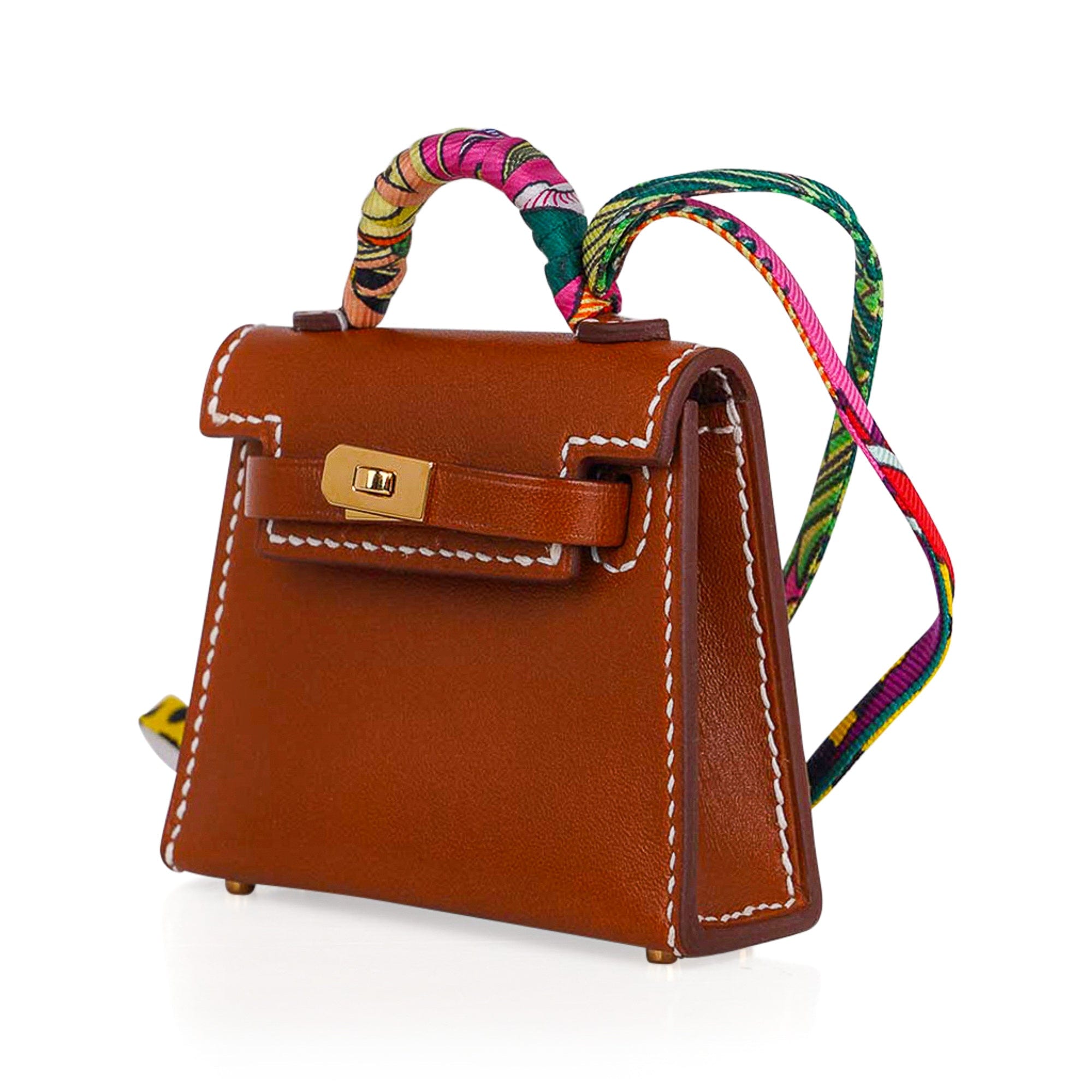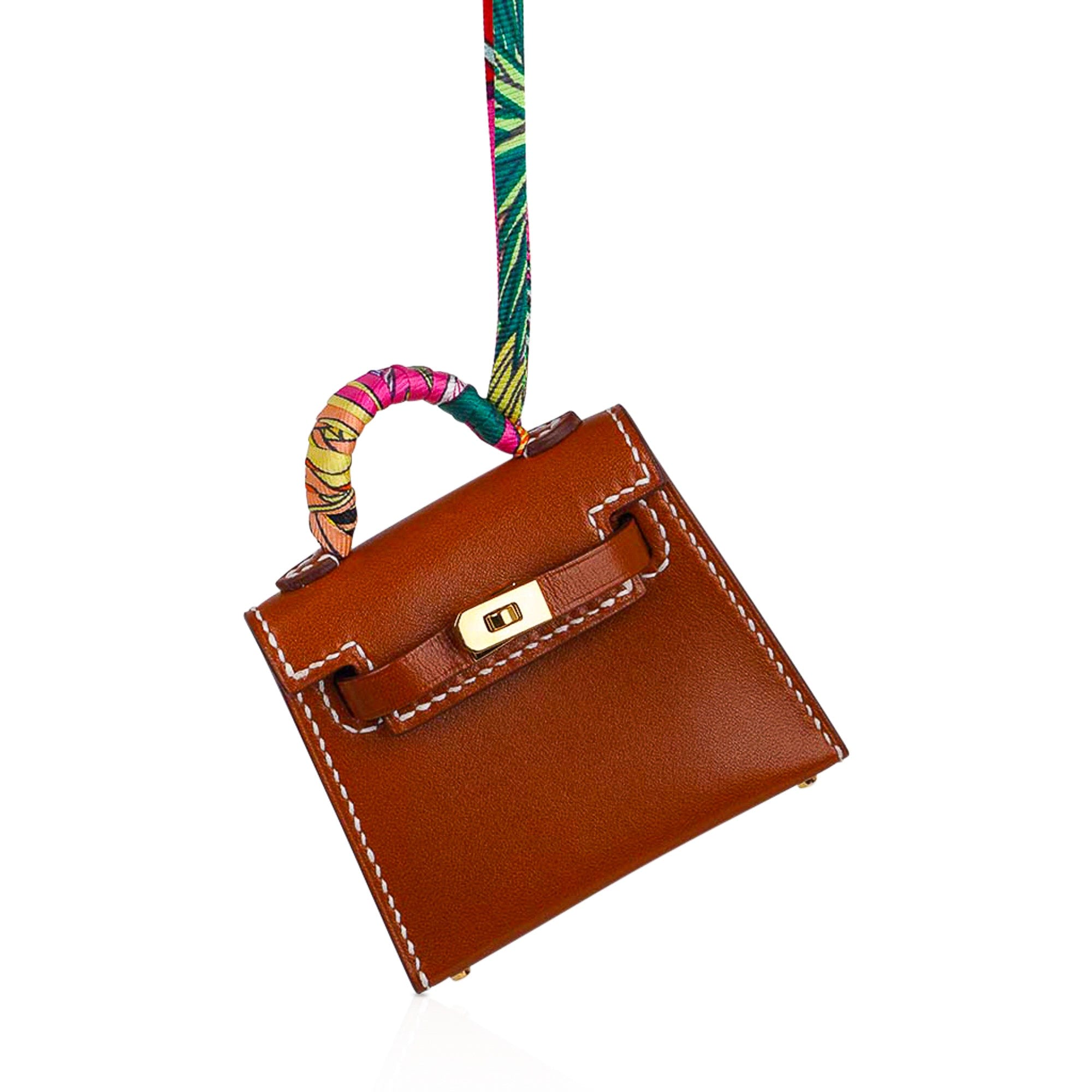 Guaranteed authentic very rare limited edition Hermes Kelly Twilly Bag Charm features a miniature Kelly in Gold with signature bone topstitch.